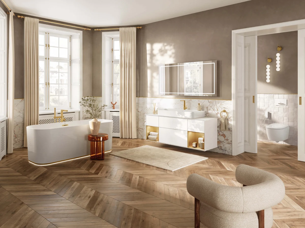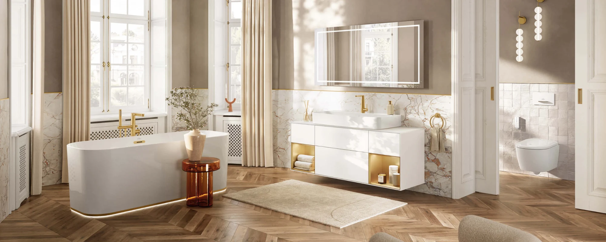 Finion møbler tilbyr generøs oppbevaringskapasitet forbedret ved SoftClosing, trykk-for-å-åpne teknologi individuelt tilpasset interiør. DirectFlush-toaletter uten kant muliggjør rask og grundig rengjøring, mens badekar i Quaryl® leverer taktil luksus i tidløse former.